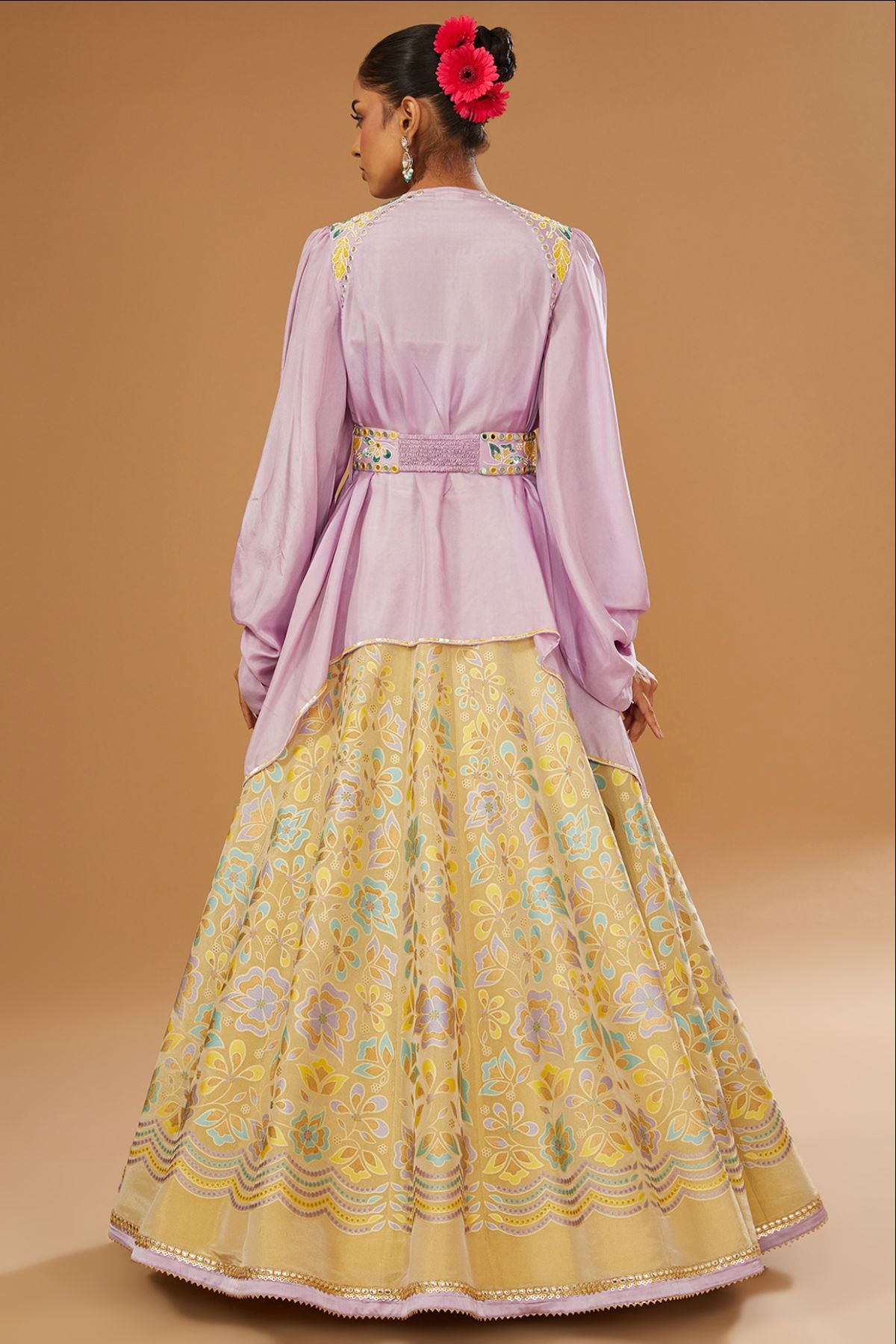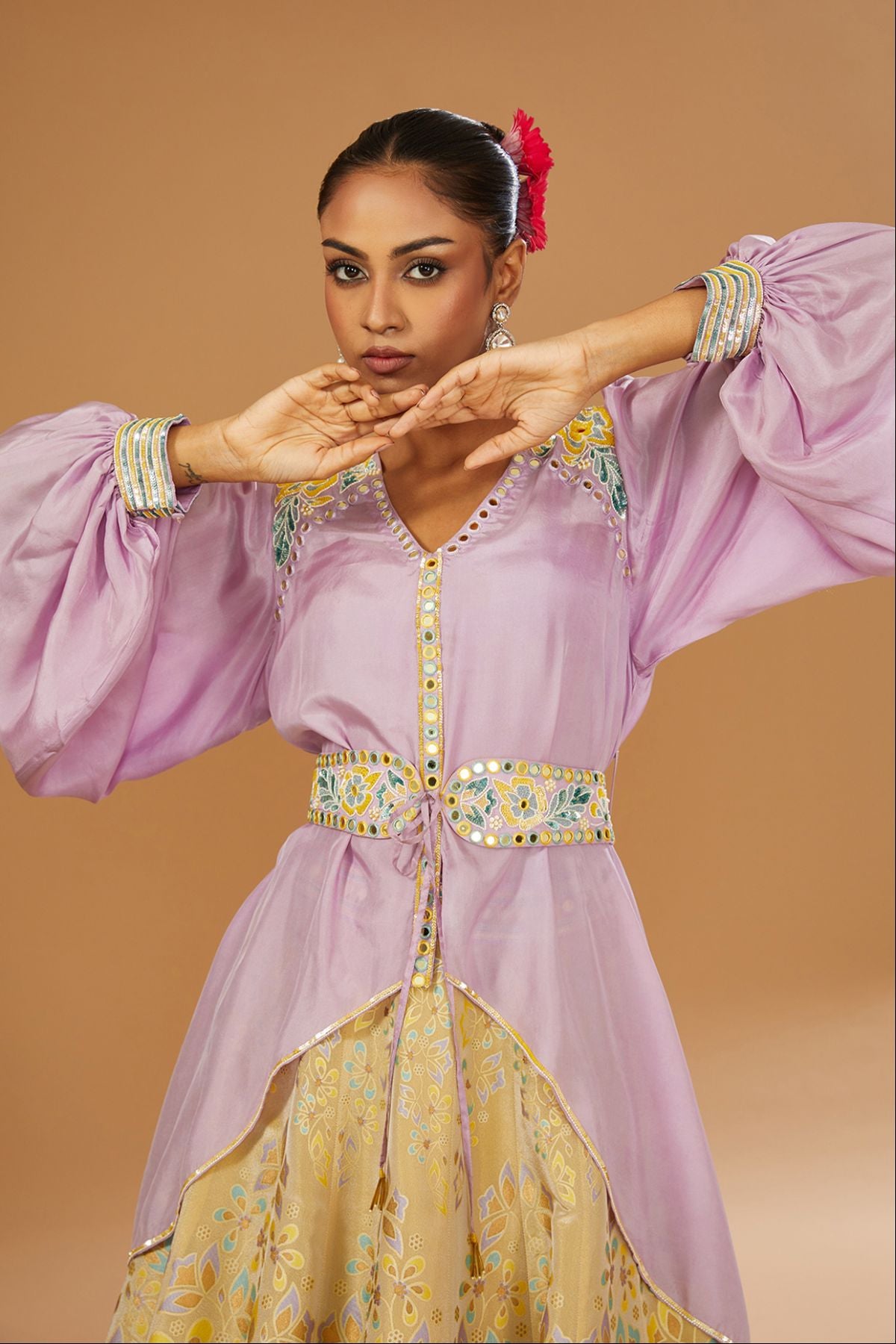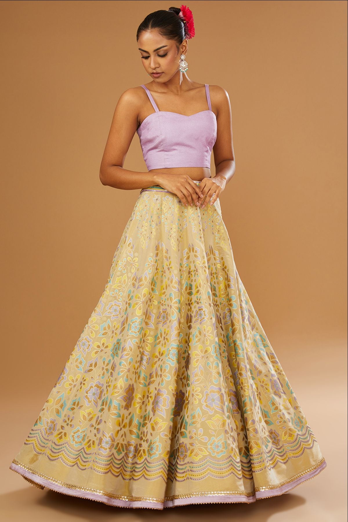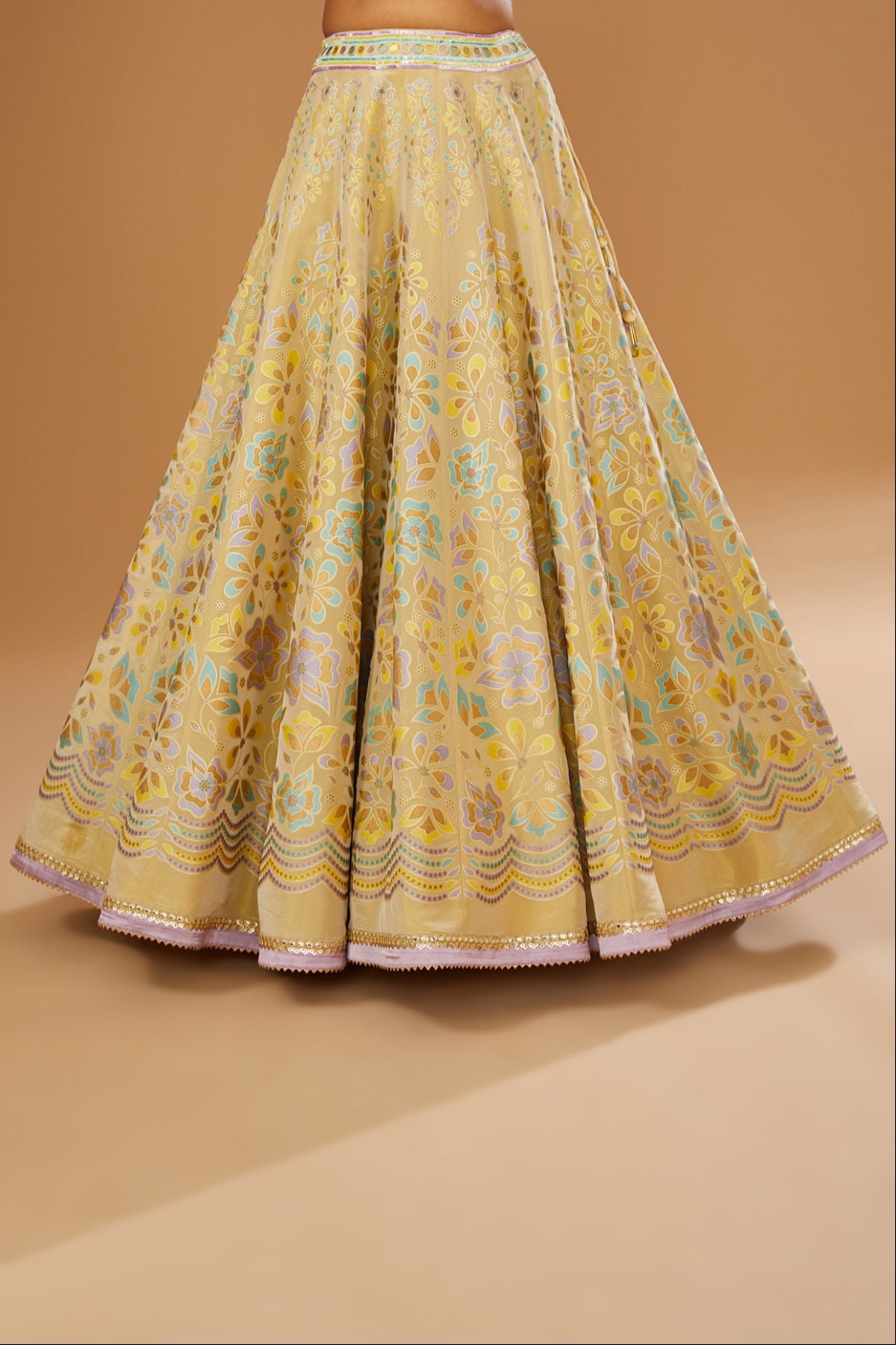 "“I AM” a glow of golden radiance. A hand-printed and hand-embroidered lehenga set that celebrates color, craft, and confidence. The ensemble features a floral hand-printed lehenga paired with a hand-embroidered mauve shirt, styled with a belt embellished with the bling of mirrors and sequins, and a slip bustier — creating a look that moves with festive elegance and luminous grace."