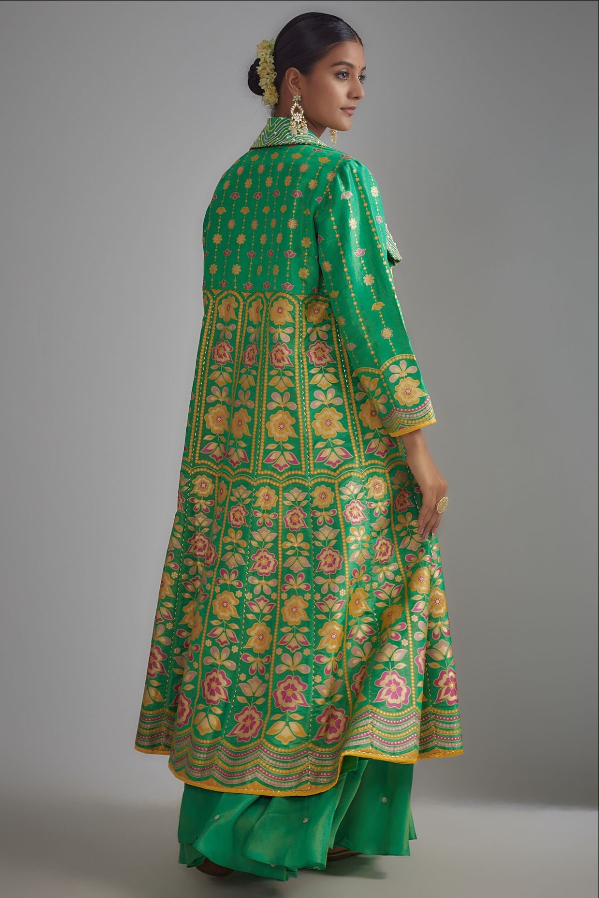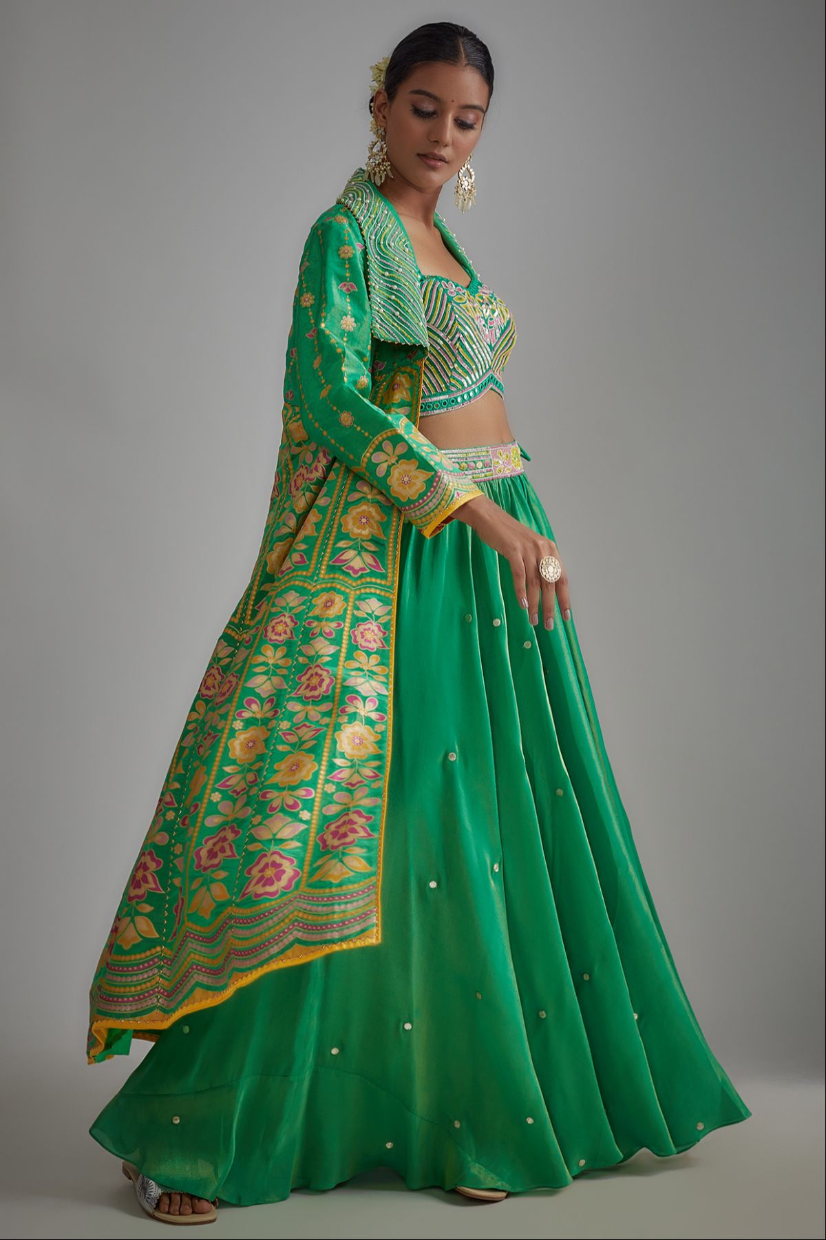 "“I AM” — a breath of green serenity. A floral hand-printed silk jacket set that celebrates color, craft, and confidence. The ensemble features a hand-printed anarkali jacket paired with a green bustier embellished with intricate embroidery, mirrors, and sequins, styled with a skirt — where heritage meets modern glamour."