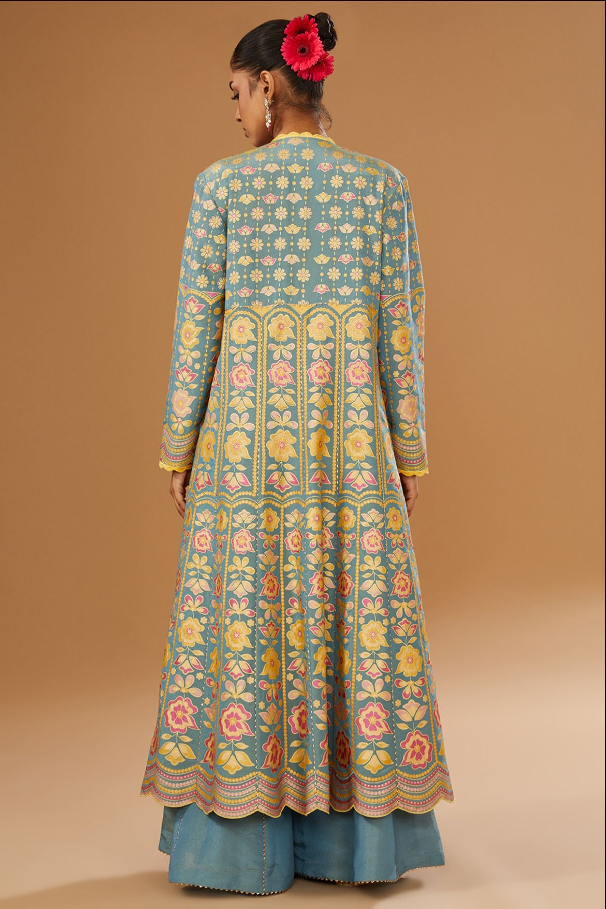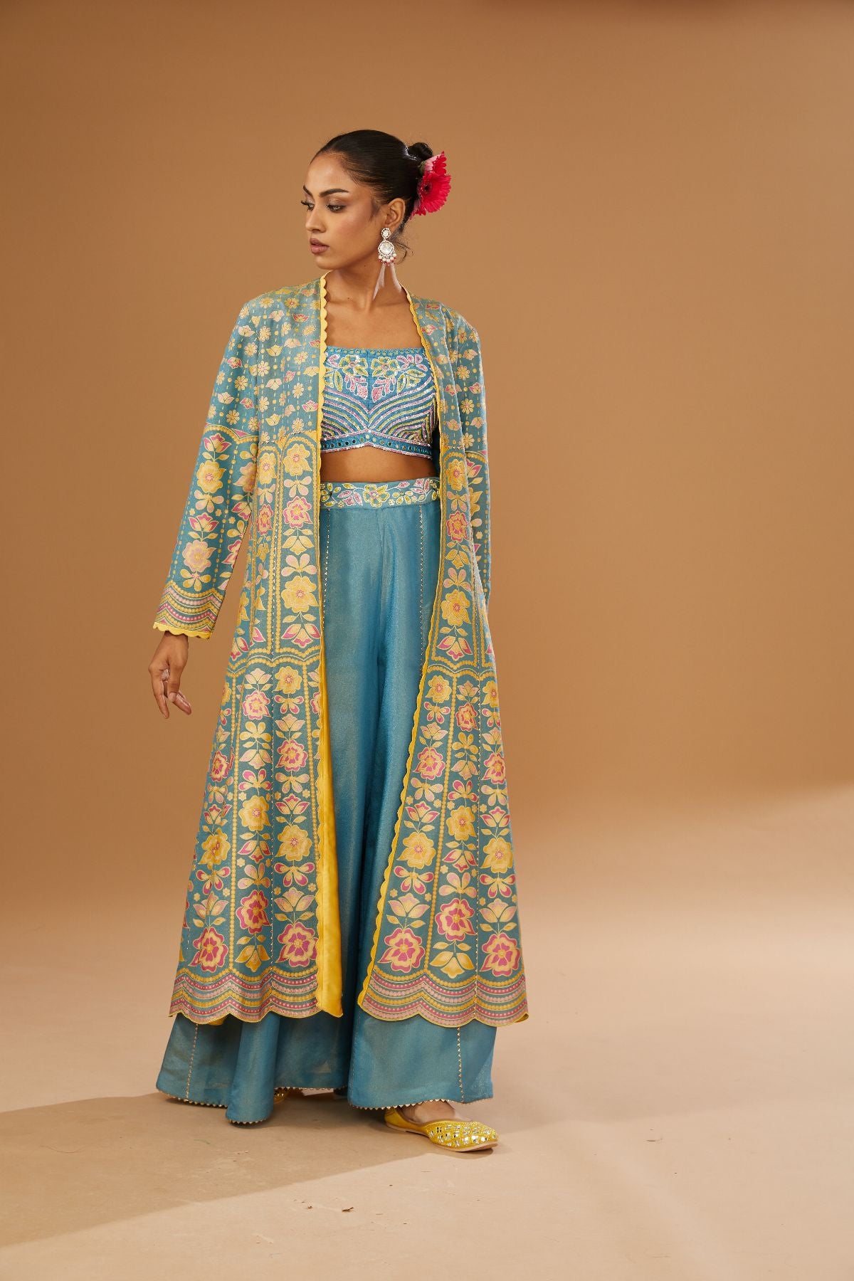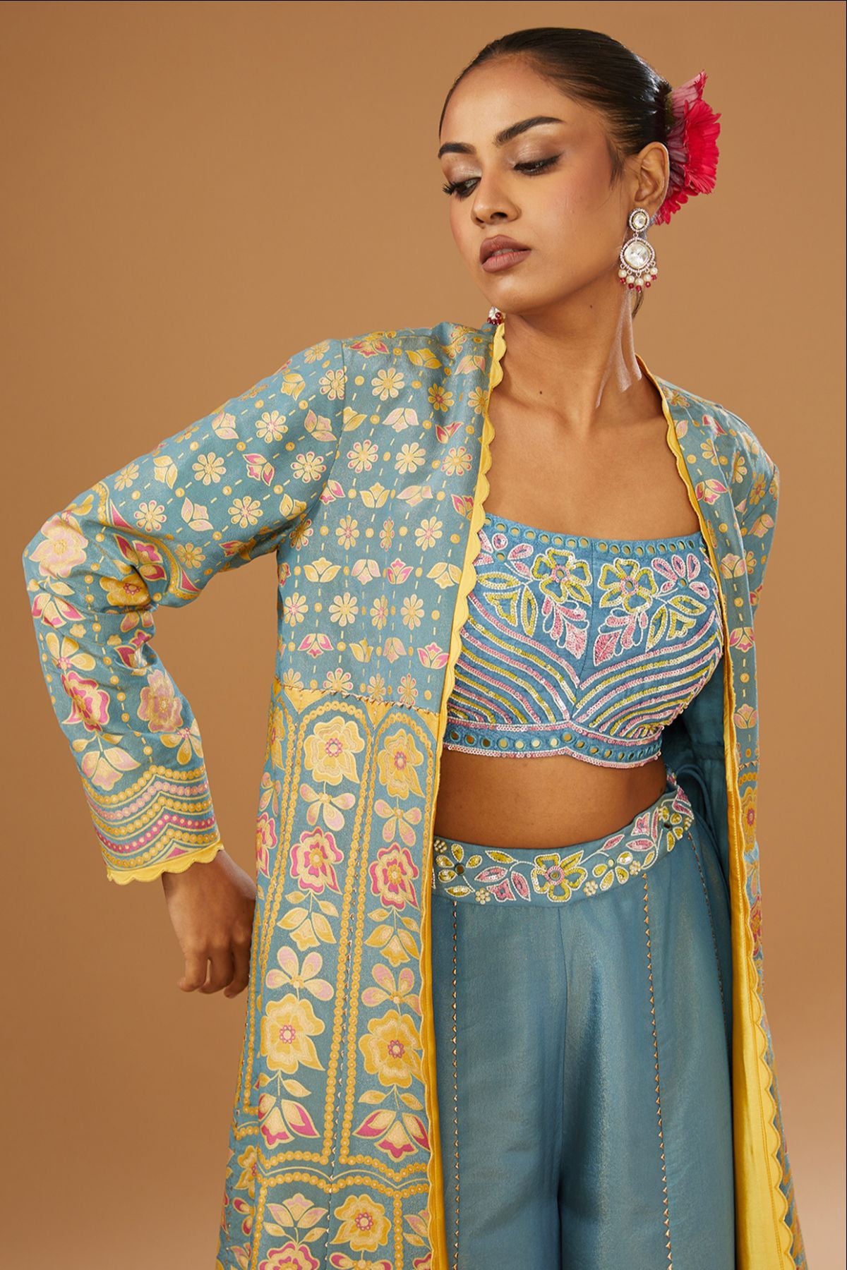 "“I AM”  a power of blue grace. A floral hand-printed silk jacket set that celebrates color, craft, and confidence. The ensemble features a hand-printed anarkali jacket paired with a blue bustier embellished with intricate embroidery, mirrors, and sequins, styled with a plazzo — where heritage meets modern glamour.
