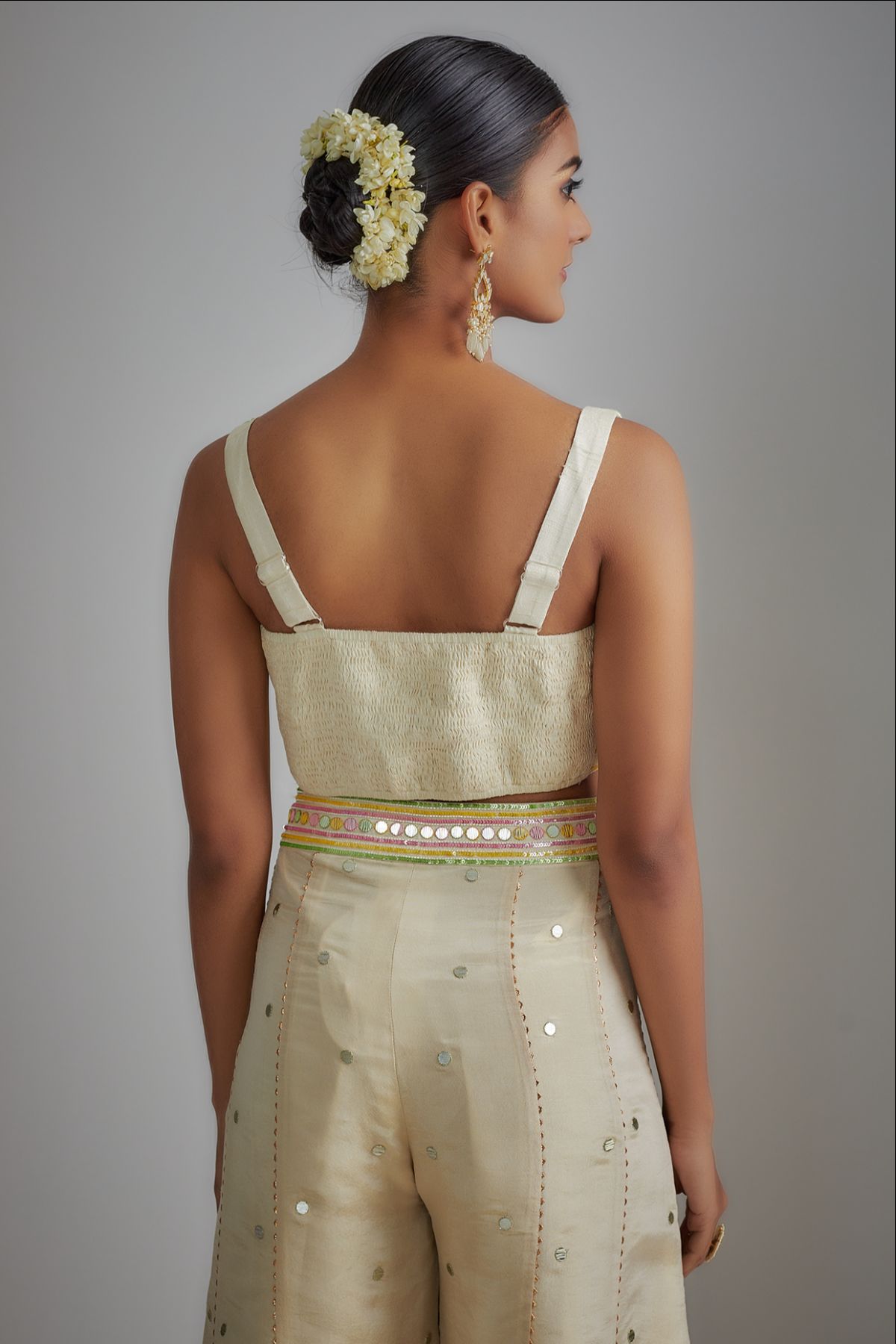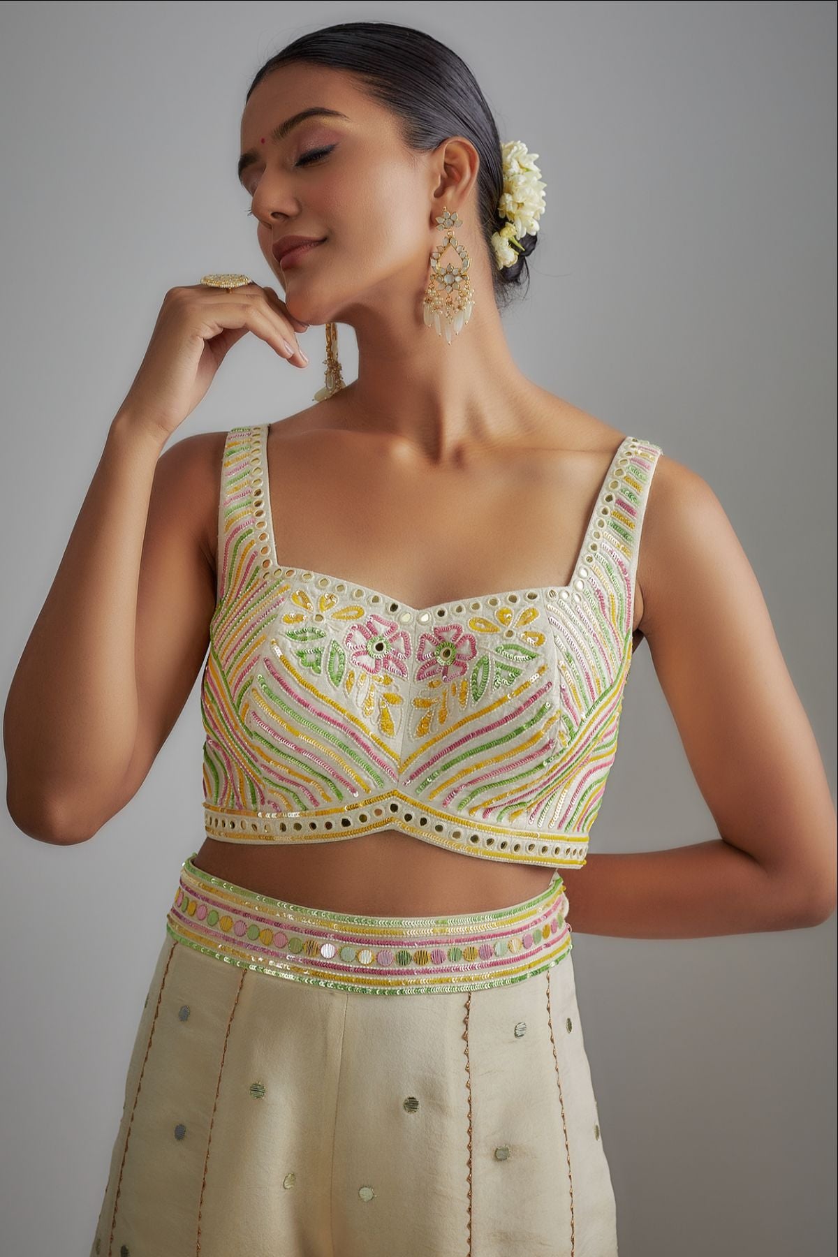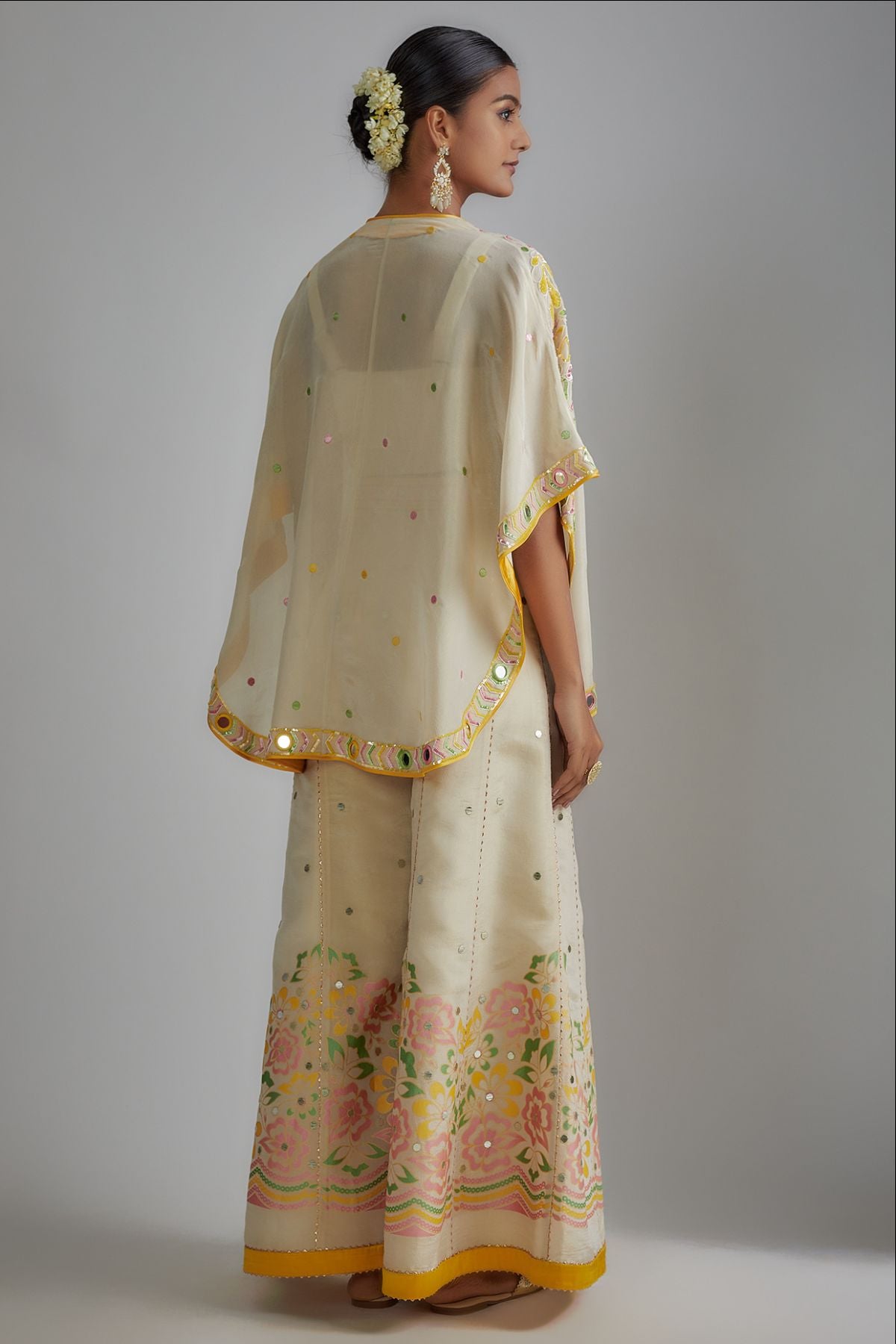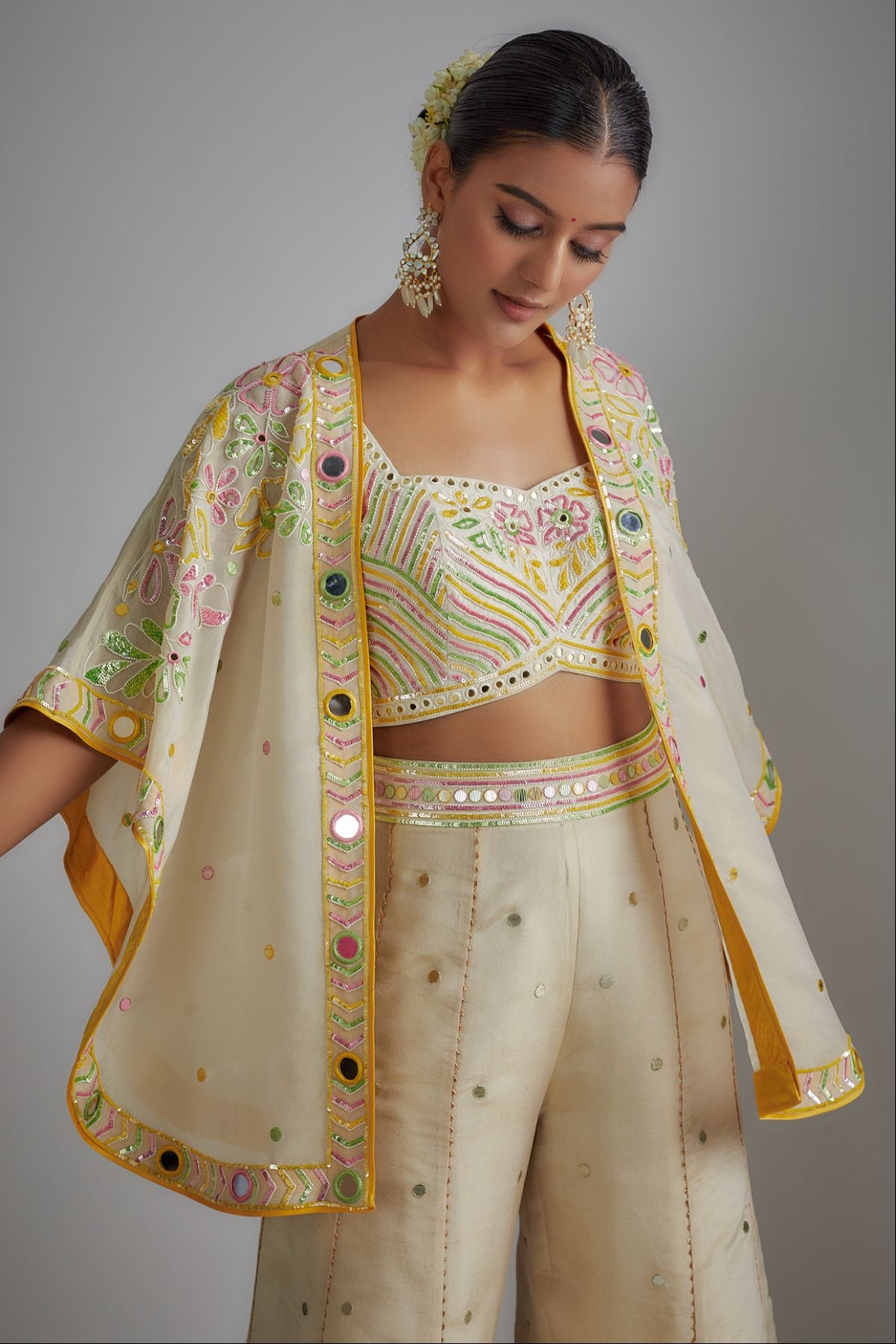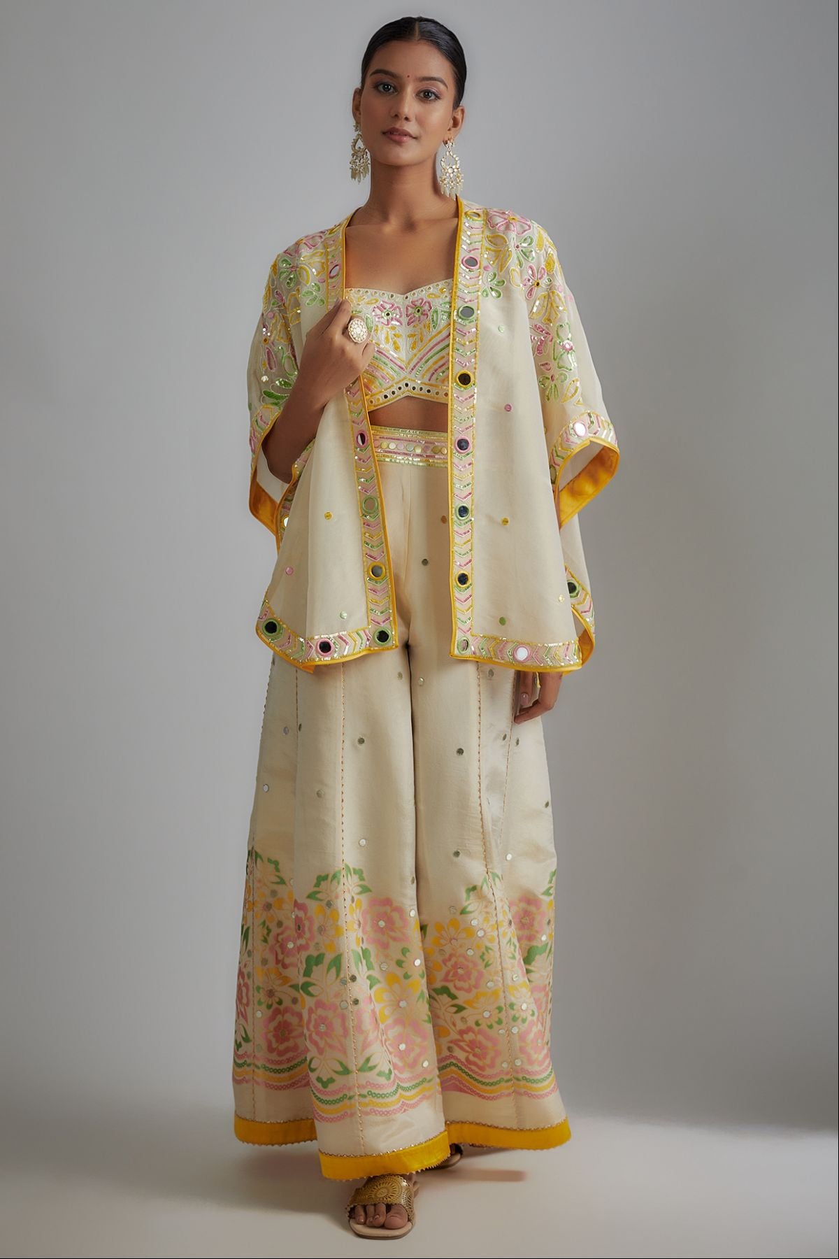 "“I AM”  a whisper of ivory grace. A floral hand-printed silk plazzo set that celebrates color, craft, and confidence. The ensemble features hand-printed plazzo paired with an ivory bustier and a delicately embroidered short cape, adorned with mirrors and sequins — a vision of effortless elegance and modern poise."