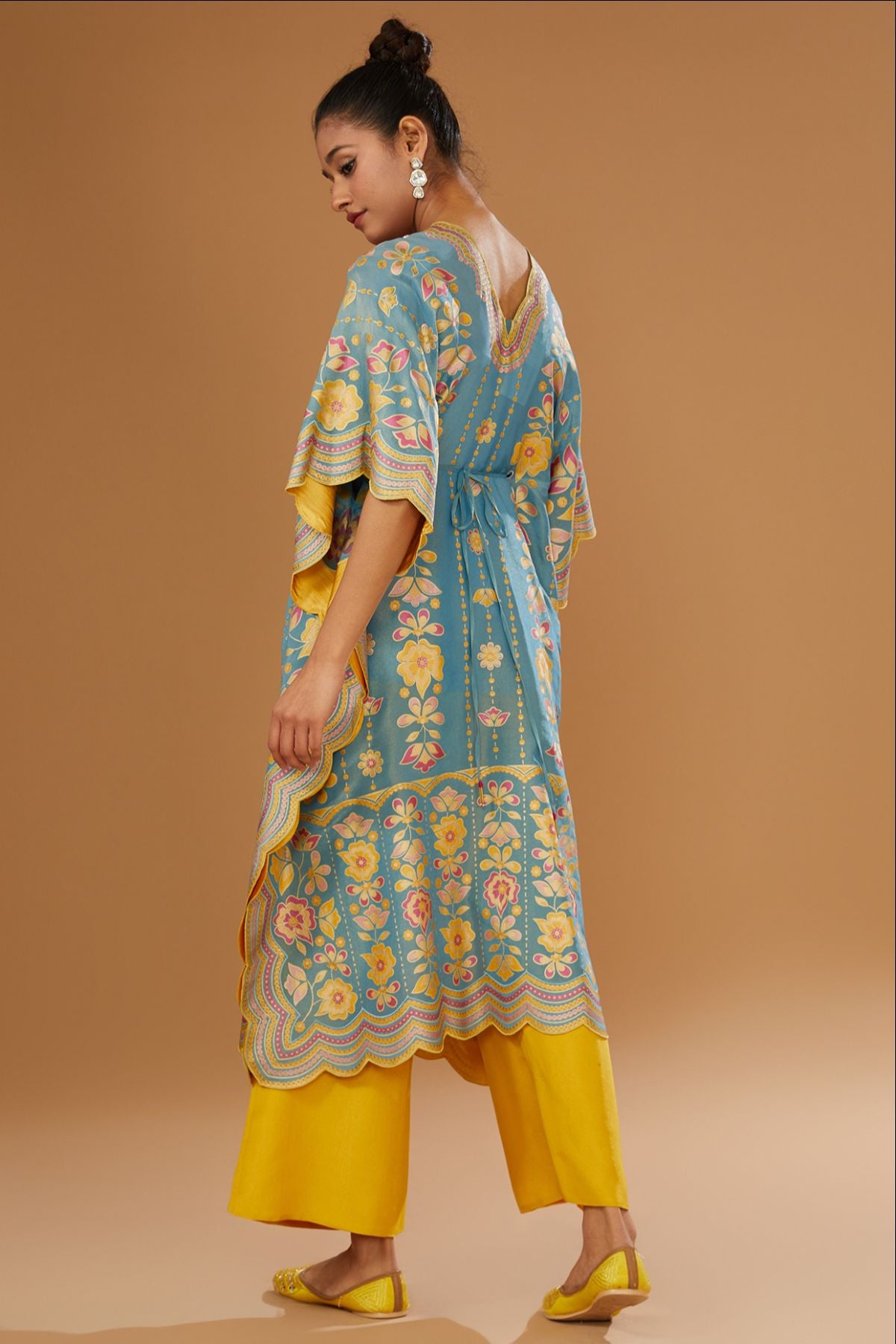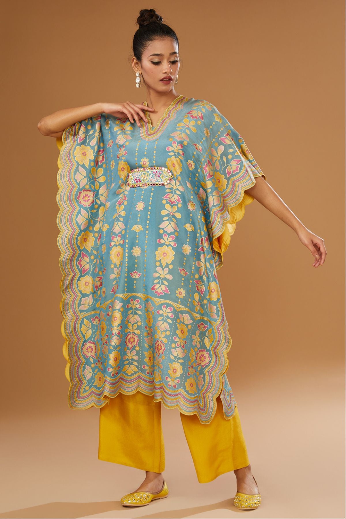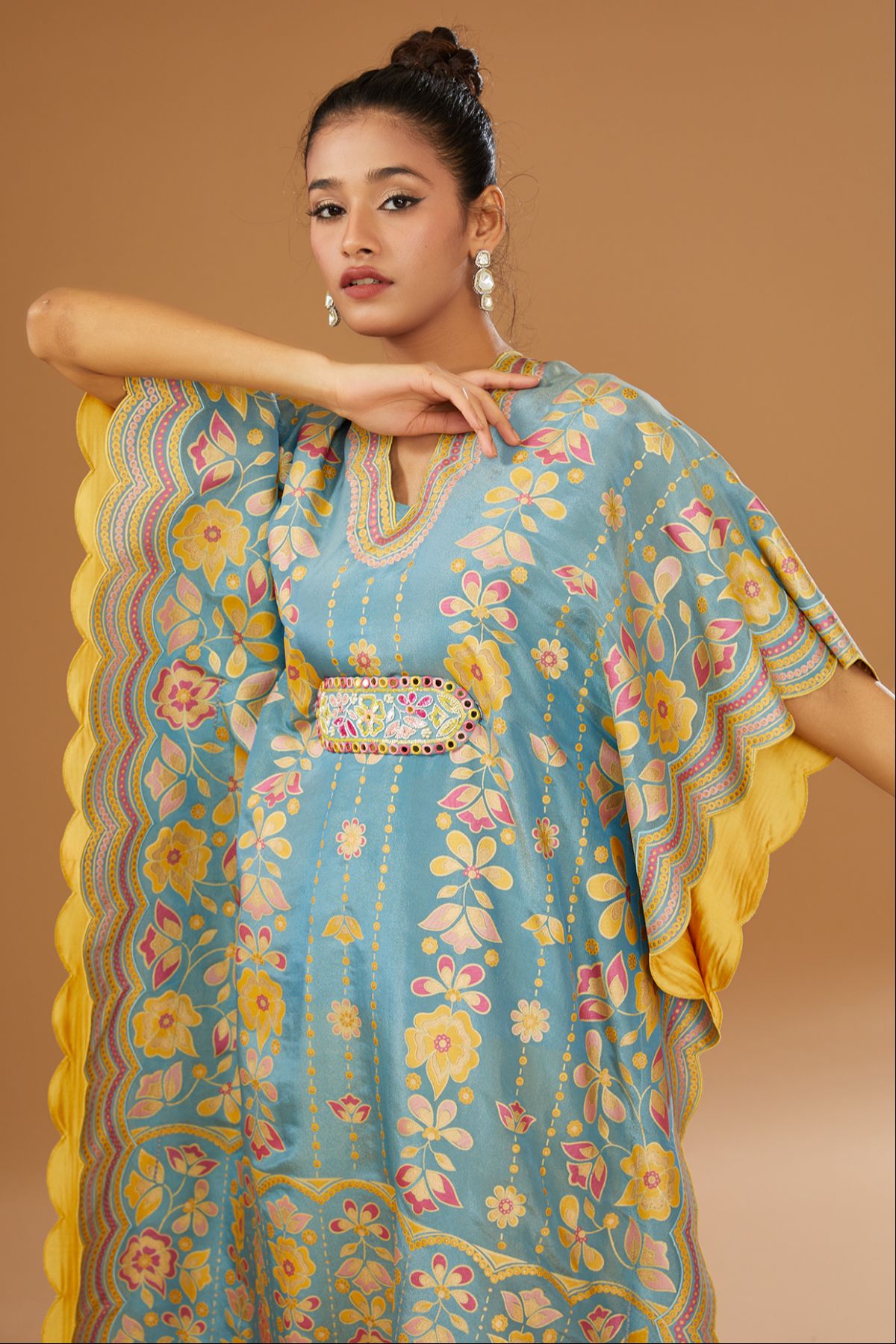 " "“I AM” — the power of blue grace. A floral hand-printed silk kaftan set that celebrates color, craft, and confidence. The ensemble features a flowy hand-printed kaftan cinched at the waist with a hand-embroidered belt adorned with mirrors and sequins, paired with a sleek slip and contrasting mustard pants — a perfect blend of effortless elegance and vibrant charm."