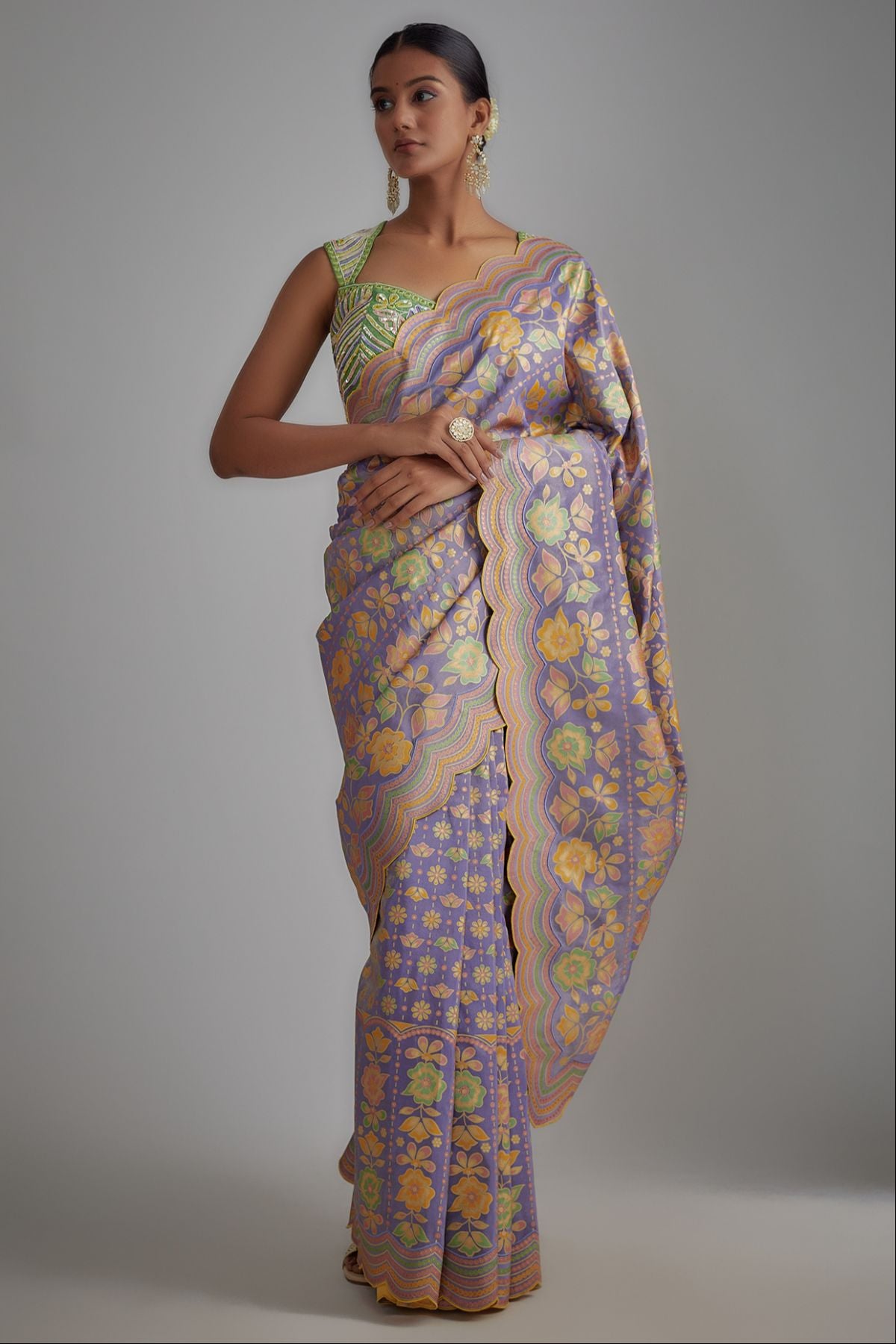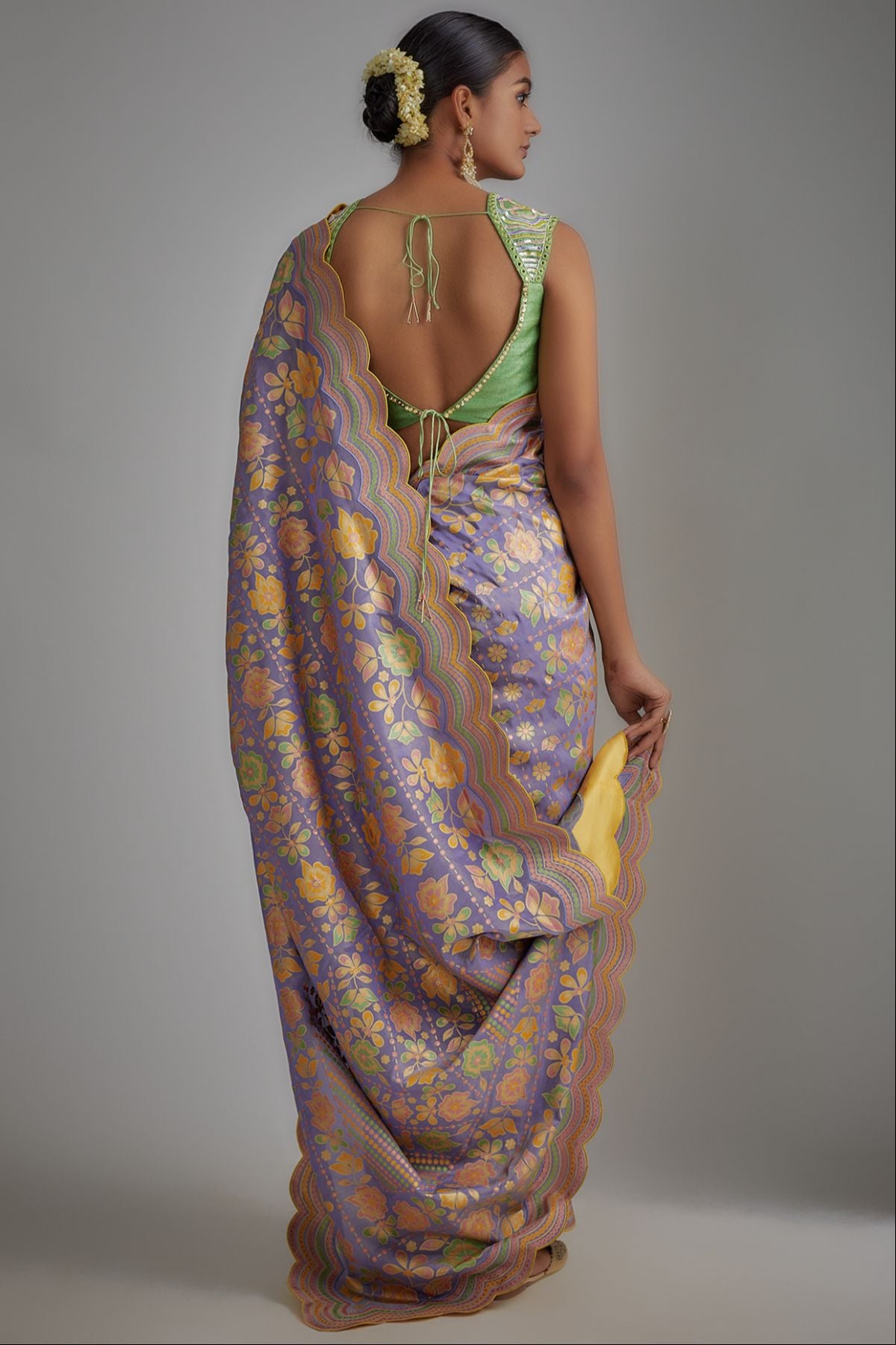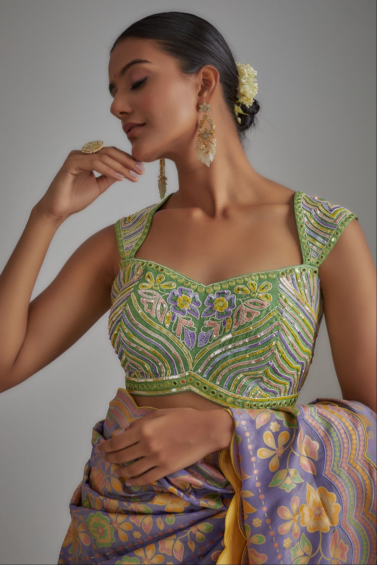 "“I AM” a mauve moment of magic. A floral hand-printed silk saree set that celebrates color, craft, and confidence. The ensemble features a hand-printed saree paired with a green blouse embellished with intricate embroidery, mirrors, and sequins — a perfect harmony of tradition, shimmer, and modern charm."