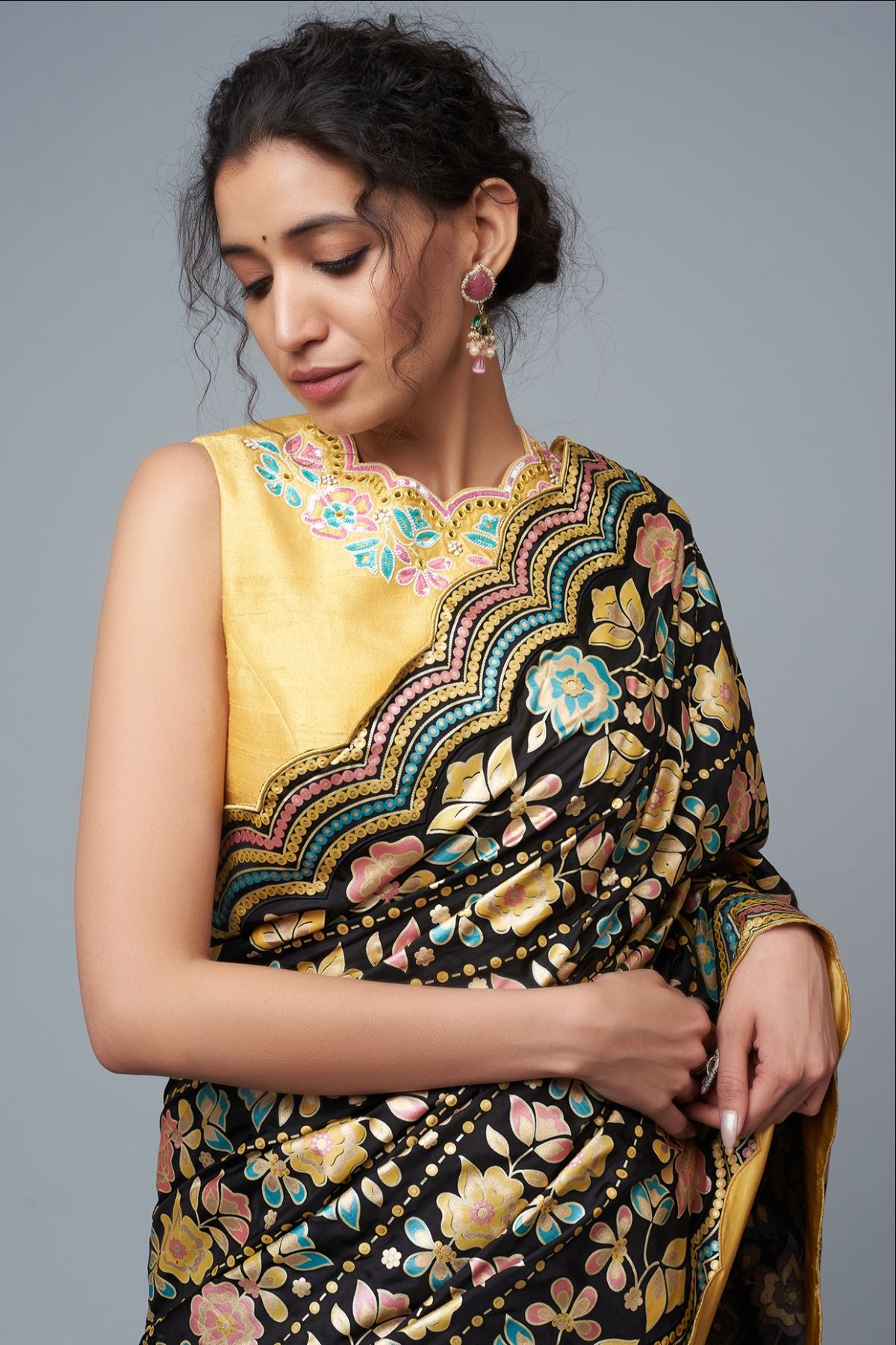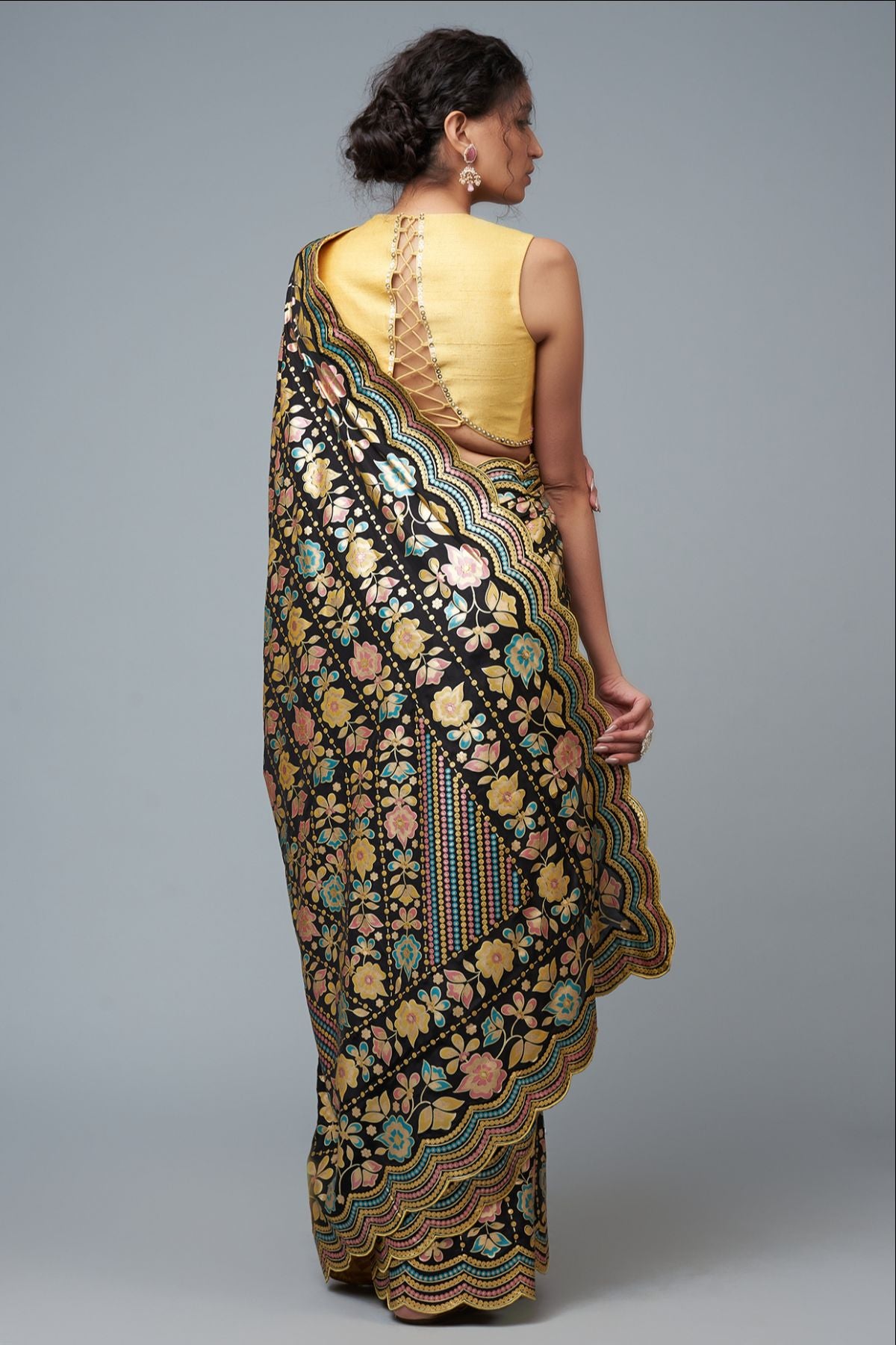 "“I AM”  a statemet in black elegance. A floral hand-printed silk saree set that celebrates color, craft, and confidence. The ensemble features a hand-printed saree paired with a mustard blouse embellished with intricate embroidery, mirrors, and sequins — a perfect harmony of tradition, shimmer, and modern charm."