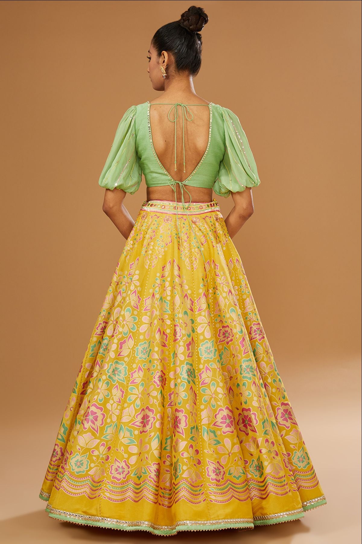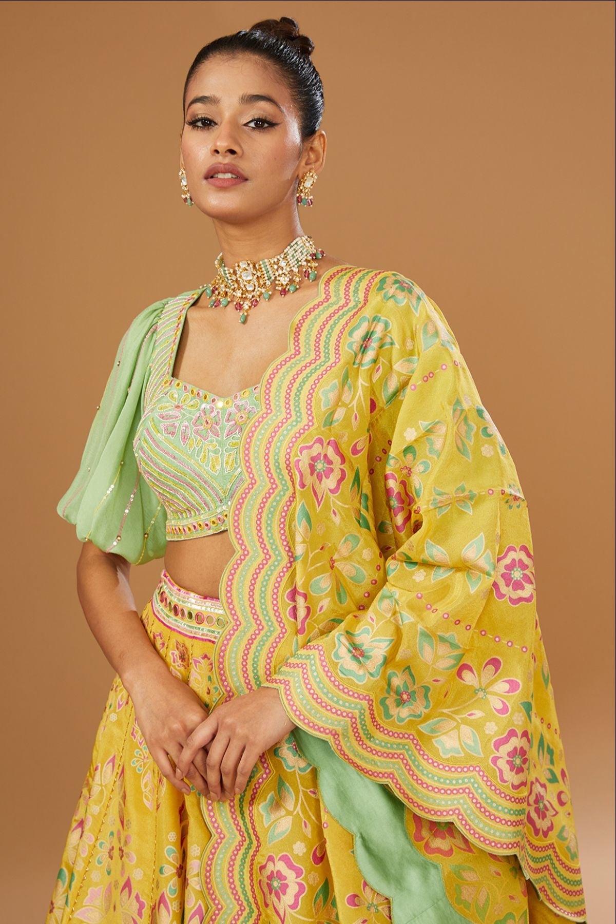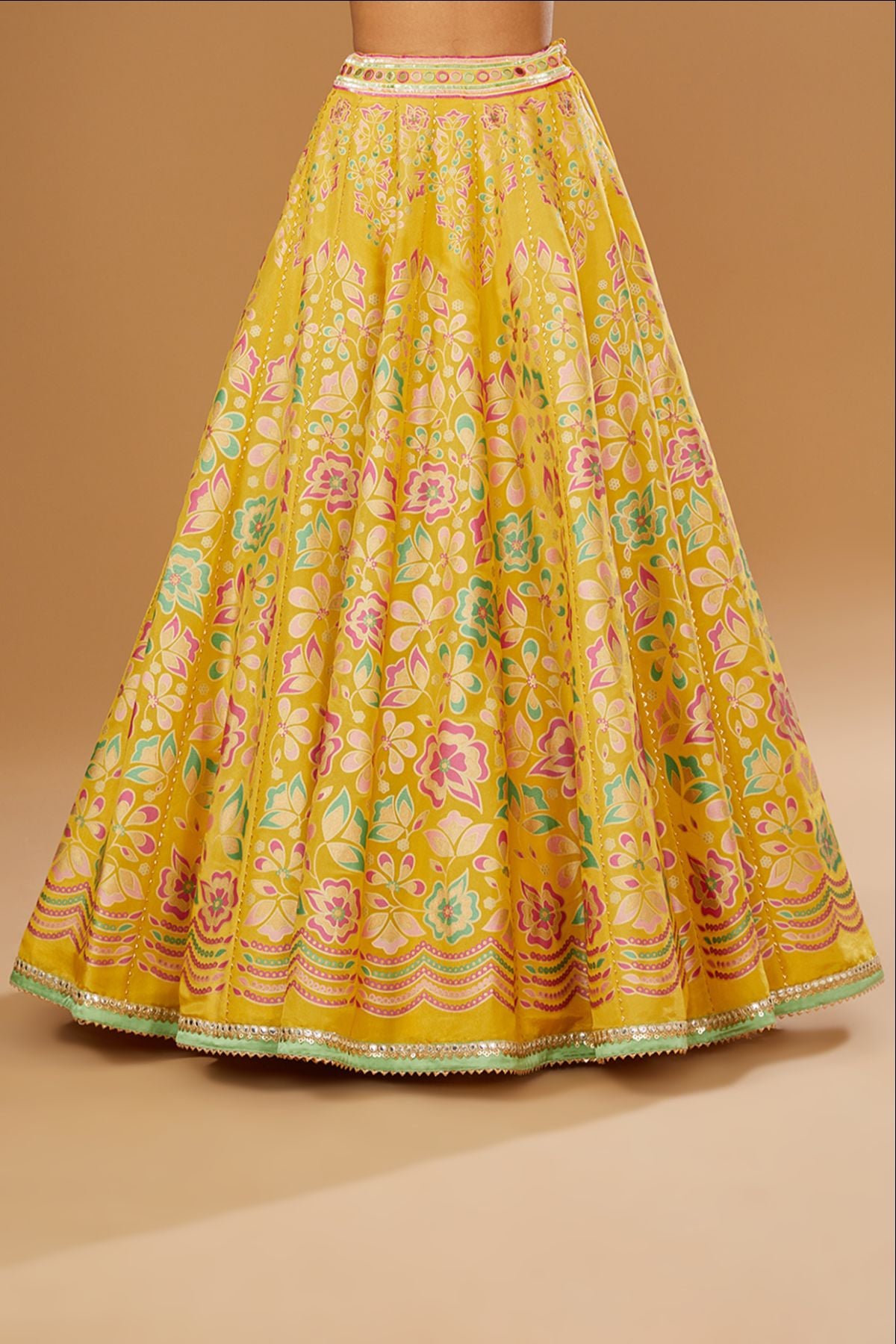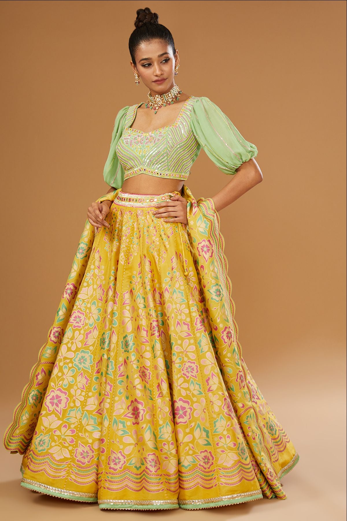 "“I AM”  warmth of mustard energy. A hand-printed and hand-embroidered lehenga set that celebrates color, craft, and confidence. The ensemble features a floral hand-printed lehenga paired with a green blouse adorned with the bling of mirrors, and sequins — completed with a matching dupatta created for the woman who glows brighter than the sunshine she wears."